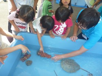 巡回水族館では「触れ合える水族館」をテーマに、ウニ・ヒトデ・ナマコといった磯の生き物のほか、イセエビ、ヤドカリ、カブトガニ、ウミガメなど、水族館では見るだけの生き物たちとも触れ合うことができます。また、普段目にする事のない海の生き物達との触れ合いには新鮮さがあり、子供たちの好奇心を呼び起こすとともに、海の生物の多様性を感じながら楽しく有意義な時間を過ごしていただけます。もちろん、大人の方にも楽しんで頂けます。